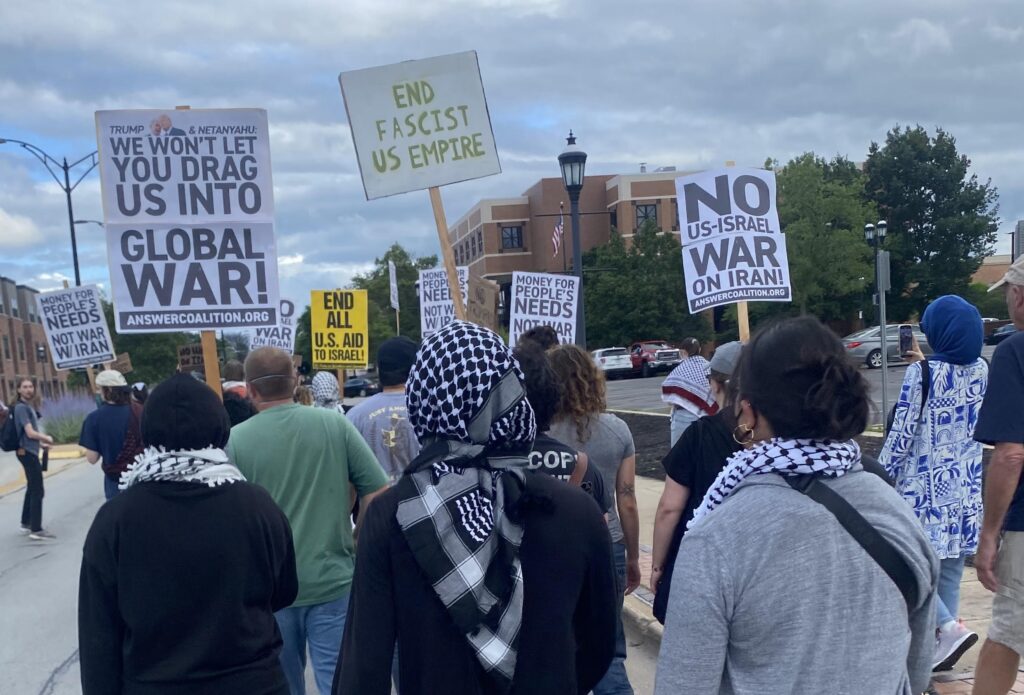 Demonstrators march by the courthouse in Urbana June 18 (a few days before the US bombing of Iran), protesting the US-backed Israeli bombing and potential US escalation. Photo by Janice Jayes