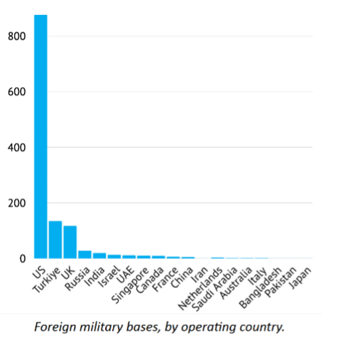 Of the nearly 1200 overseas military sites operating in the world, the US has nearly 900 while Iran has one—yet the US accuses Iran of military adventurism. Source: World Beyond War Report, 2025