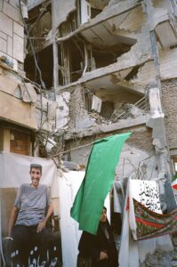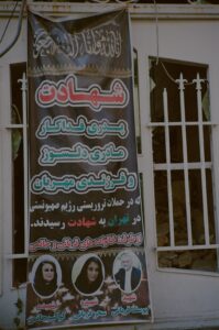 A banner affixed to the ruins of a residential building laments the loss of a father, mother and daughter in the summer’s bombing on Tehran. Photo by Calla Walsh, used by permission