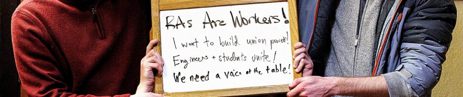Kuyper Santora, one of GEO’s organizers for the campaign, described the testimonies of RAs as revealing the overwork and unsafe working conditions that they were experiencing—the meat and drink of GEO’s work. The more other RAs heard their peers’ accounts of their experiences, the faster the movement came together. Changes in US immigration under the Trump administration that affected student visas also helped to galvanize RA support to unionize. Reports that more than 50 students received short-notice visa revocations (for F-1 and J-1 visas) via email in March, giving them one week to leave the United States, justifiably unsettled international students and their GEO colleagues; a lukewarm response from university administration shook a lot of students’ confidence that the university is invested in their ability to complete their programs and their feeling that they belong on campus. During the eight-month campaign organizers posted themselves at tables across campus to raise awareness about the campaign, organized events, made office visits, and spread the word far and wide about what the union could do for RAs. By the time it came to a petition, over 1300 RAs signed on to support unionization—35 percent of all RAs at UIUC, which tidily exceeds the statutory requirement of 30 percent needed to allow RAs to vote to be represented by GEO.