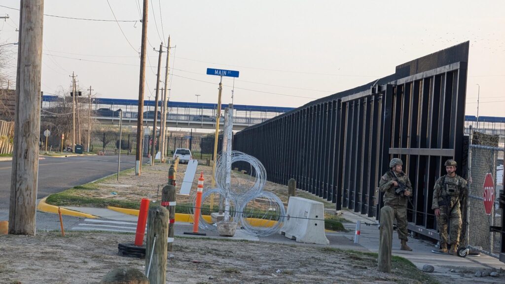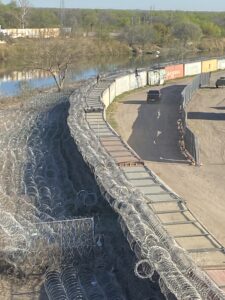 The National Guard fortifications in the city park that once was the site of a Kickapoo settlement, viewed from the International Bridge. Photo courtesy of Witness at the Border delegation, March, 2025
