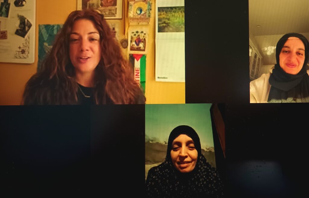 Ear-to-ear smiles form on all three women’s faces when Asma appears on Zoom from 6,000 miles away in Khan Younis in the occupied Gaza Strip, Palestine. She and her family are still alive after more than 750 days of being bombed by Israel with weapons supplied by the United States. They are living in a crowded tent camp along the Mediterranean coast.