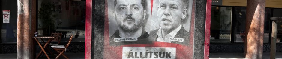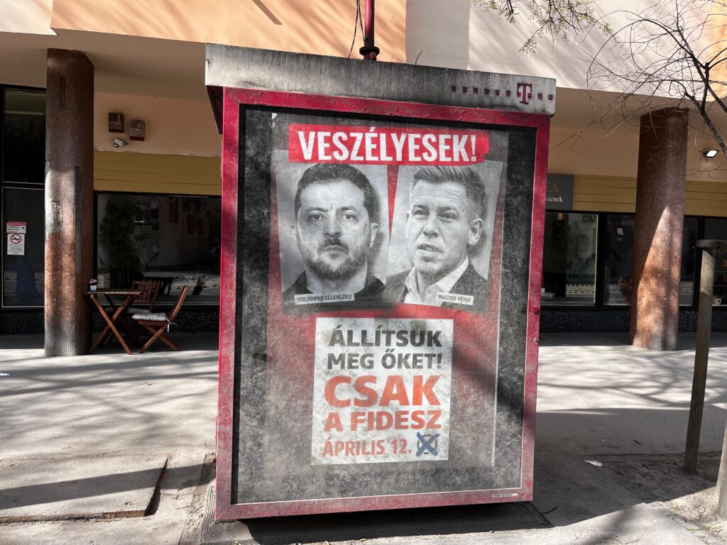 One of the ubiquitous Fidesz campaign posters, on a main Budapest avenue. It shows mugshot-type-photos of Ukrainian President Volodymyr Zelenskyy and opposition candidate Péter Magyar; the text reads “DANGEROUS!” above, and “LET’S STOP THEM! ONLY FIDESZ, APRIL 12 [the date of the coming election] below.” Photo by Ábel Esbenshade