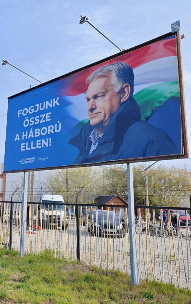 Roadside billboard urging the reelection of Prime Minister Orbán. The text reads “LET’S UNITE AGAINST THE WAR!” Photo by Ándor Elekes, used by Creative Commons License CC-BY-4.0